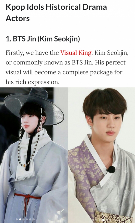 방탄소년단(BTS) 진이 최고의 사극 배우가 될 K팝 남자아이돌에 선정되며 '배우 김석진'을 향한 기대감으로 폭발적인 반응을 이끌었다.