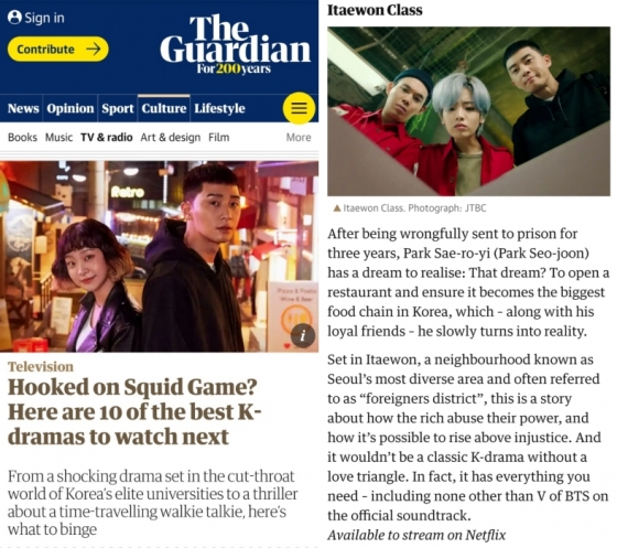 방탄소년단(BTS) 뷔가 OST에 참여한 드라마 '이태원 클라쓰'가 영국 가디언(Guardian)이 추천한 '최고의 K-드라마 10편'에 선정되었다.