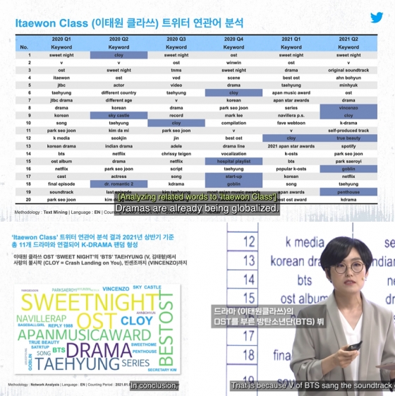 '전 세계 트위터에서 가장 많이 트윗된 한국 드라마, 웹툰, 영화 TOP20'에서 2위를 차지한 '이태원 클라쓰'의 경우 트위터 연관어에는 'Sweet Night', 'V', 'OST'가 1, 2, 3위를 휩쓸며 트위터를 장악해 뷔의 영향력을 실감케 했다.