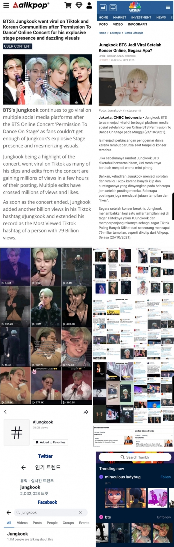 최근 미국 매체 '올케이팝'(allkpop)과 인도네시아 TV 채널 'CNBC Indonesia'(CNBC 인도네시아)는 방탄소년단 온라인 콘서트 'BTS 퍼미션 투 댄스 온 스테이지(PERMISSION TO DANCE ON STAGE)'이후 멤버 정국이 소셜미디어에서 바이럴된 엄청난 인기를 주목해 보도했다.