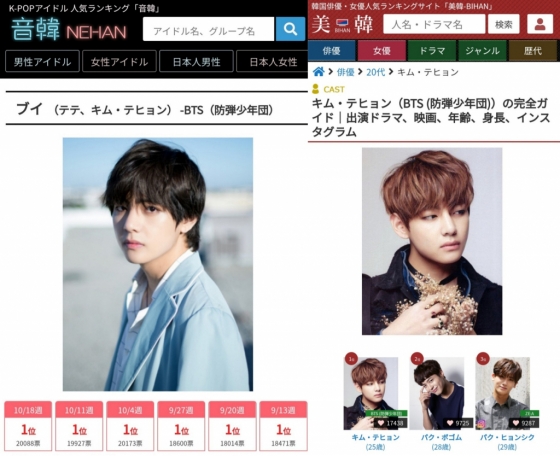 10월 18일부터 10월 25일까지 진행된 일본 인기 아이돌 랭킹 사이트 '네한(音韓)'의 'K-POP 남성 아이돌 랭킹' 투표에서 뷔가 2만 88표를 획득하며 30주 연속 1위의 대기록을 달성했다.