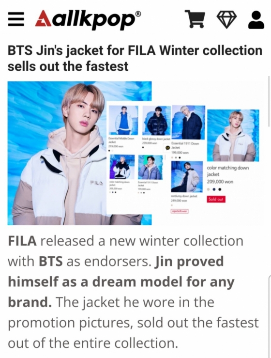 영상 공개 후 진이 입었던 다운 재킷은 휠라 코리아(FILA KOREA) 공식 싸이트에서 빠르게 품절 됐다. 진은 최고의 광고 모델로서의 입지를 다지며 진정한 '품절킹' 면모를 보여줬다.