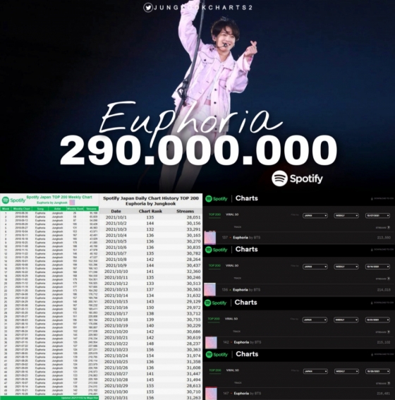 또 'Euphoria'는 K팝 솔로 최초로 일본 스포티파이에서 50주 차트인했고 주간 TOP200 차트에서 K팝 솔로 최장 차트인을 기록 갱신했다.