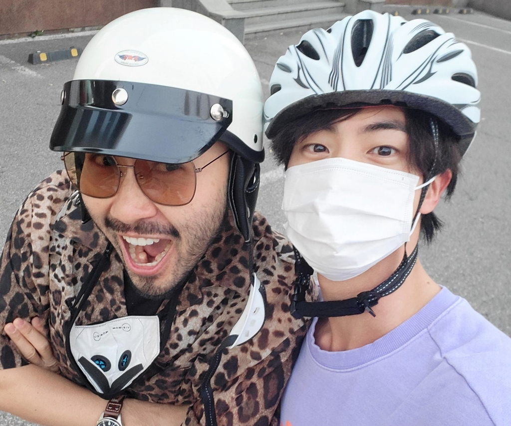 사진속에는 연한 보라색 트레이닝복을 입은 진이 배낭을 메고 헬멧을 쓴 채 한 손은 엄지척 포즈를 취하며 자전거와 서있는 모습이 담겨있다.