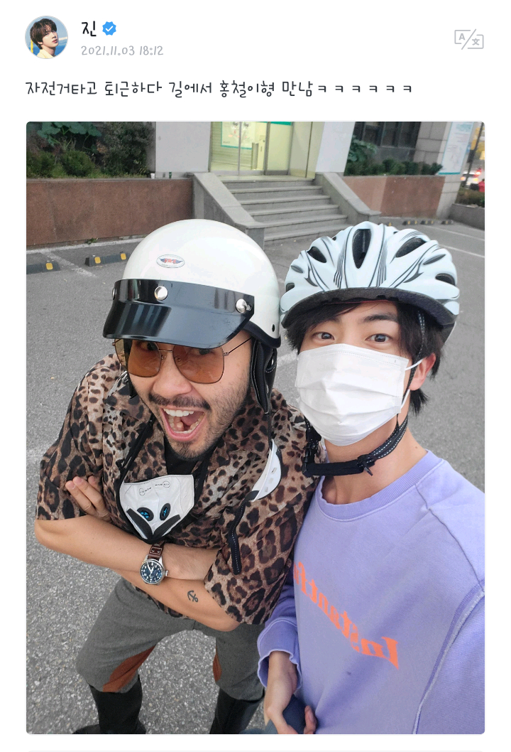 팬들은 "인생이 영화야 시트콤이야 어떻게 만났을까?", "급만남 너무 웃겨ㅋㅋ", "시트콤 찍냐고 이 왕귀염둥이야", "우리 석진이는 퇴근길도 귀여워", "석진아 나도 서울살면 마주칠수 있을까? 홍철님 너무 부러워", "석진아 안전모 꼭 쓰고 조심해서 들어가", "석진이 퇴근! 나도 퇴근! 오늘도 수고했어", "석진이 어쩜 이렇게 쉼쉬듯 귀엽냐, 들숨에 귀염 날숨에 귀염", "얼굴확대해보고 천국감, 석진이 나이 또 뱉어낸다", "헬멧 배낭 물통까지 야무지게 다 갖춘거봐, 김석진 너무 귀엽다", "왕귀염둥이 퇴근한다고 얘기도 해주고 진짜 다정해ㅠㅠ"등 깊은 애정을 나타냈다.