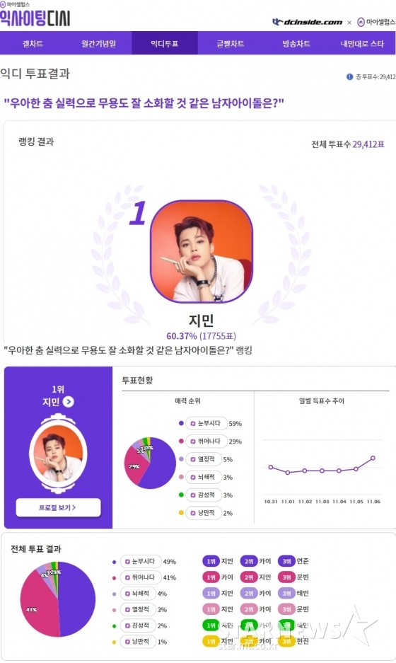 지민은 지난 10월 31일부터 11월 6일까지 익사이팅디시에서 진행된 '우아한 춤 실력으로 무용도 잘 소화할 것 같은 남자 아이돌은?' 설문에서 1위를 차지했다.