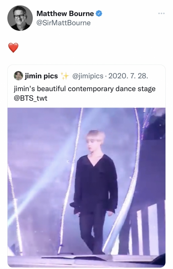 뿐만 아니라 토니상(Tony Awards)에서 뮤지컬 최고 안무가상과 최고 연출가상을 동시 수상한 영국 최고 안무가 매튜 본은 과거 지민의 현대무용 영상을 자신의 SNS에 '하트' 이모티콘과 함께 리트윗으로 많은 이들의 관심을 모은바 있다.