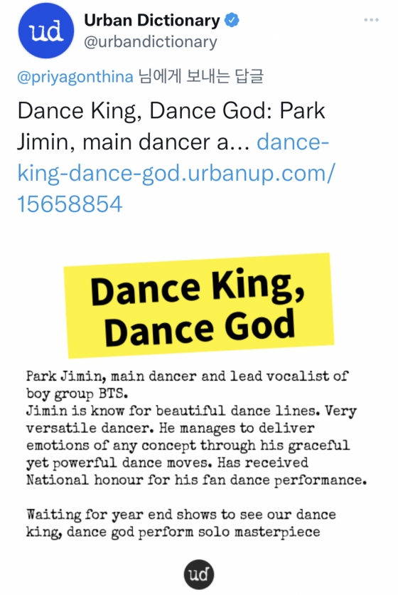 영미권 인터넷사전 '어반 딕셔너리'(Urban Dictionary)에서 지민은 'Dance God'이자 'Dance King'으로 정의될 정도의 세계적 춤의 왕으로, 세계적 명장들의 찬사와 함께 대중들에게도 뜨거운 사랑을 받고 있다.