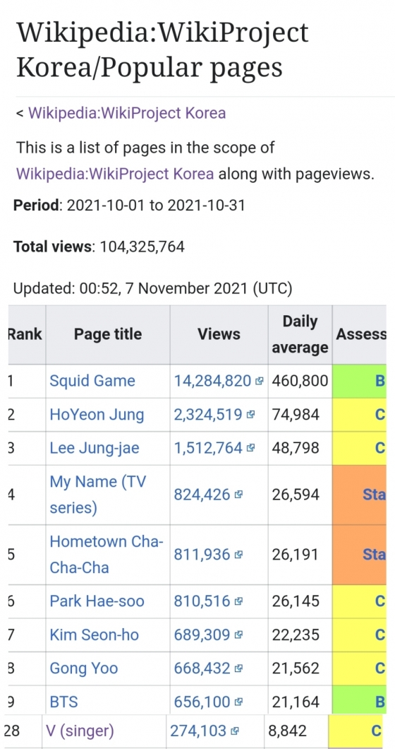 영문판 위키피디아 페이지는 전세계 네티즌들에게 갖는 화제성과 파급력을 수치화 할 수 있는 검증된 지표라 할 수 있다.