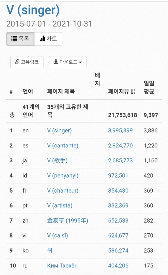뷔는 2021년 10월 위키피디아 한국 프로젝트 페이지(영문판) 공식랭킹에서 총 27만 4103건을 기록해 남자 가수 랭킹 1위에 올랐다.