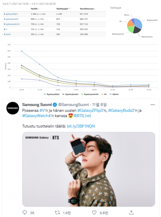방탄소년단(BTS) 뷔가 핀란드 트위터 분석사이트의 '가장 많이 언급된 트위터 톱5'에 삼성 갤럭시 제품군과 함께 이름을 올리며 글로벌 화제성을 입증했다.