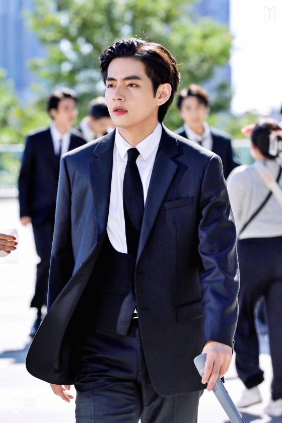 공개된 사진에서 블랙수트를 착용한 뷔는 최강의 슈트핏으로 품격 있는 젠틀미를 뽐냈으며, 잘 빗어 넘긴 머리로 드러난 조각 같은 이목구비는 자연광 아래서 햇빛보다 더 빛나 팬들의 탄사를 자아냈다.