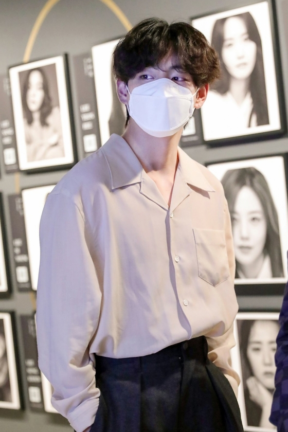 한국문화원에서 열린 '한국 영화대표배우 200인 사진전'을 관람하고 한국 대표 배우들의 사진 앞에서 서 있는 뷔는 마스크를 하고 있었지만 잘생긴 이목구비와 세련된 우아함을 감출 수 없었다.