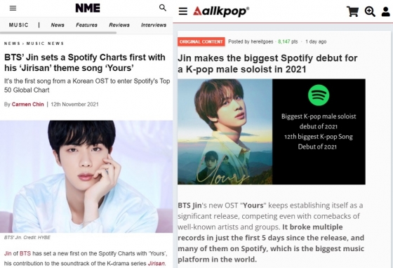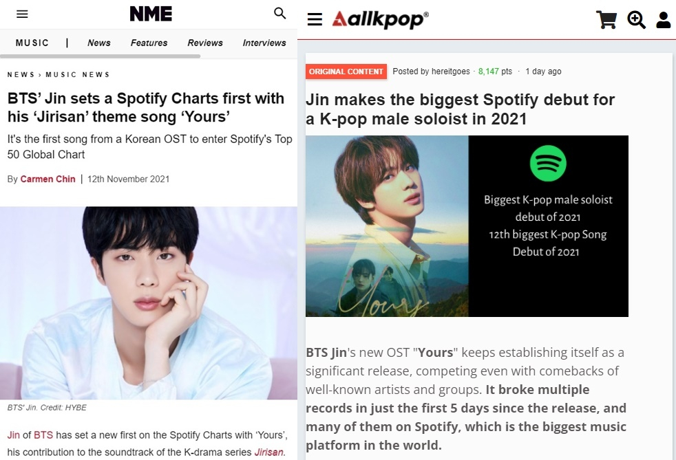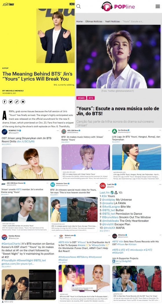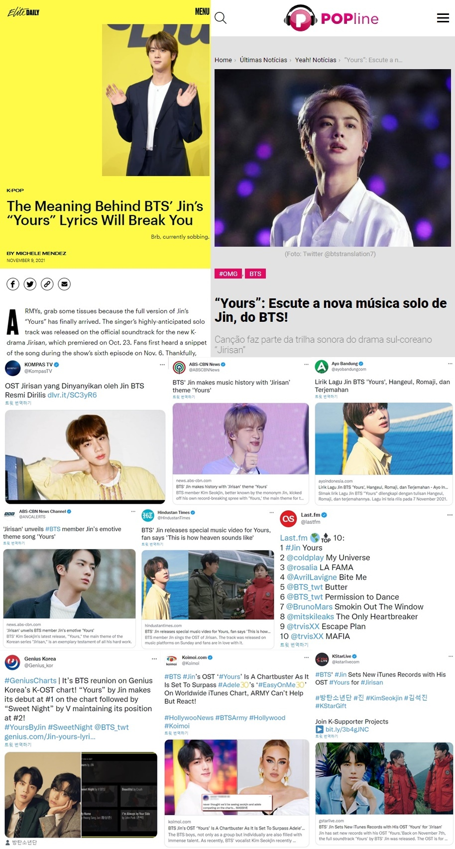 이 밖에도 엘리트 데일리(Elite Daily), '지니어스 코리아(Genius korea)', 더 스코어 매거진(The Score Magazine), POPline, KOMPAS TV, ABS-CBN News, Ayo Bandung 등 전 세계 저명한 음악 매체들이 'yours'를 통해 보여준 진의 놀라운 재능과 강력한 브랜드 파워를 주시했다.