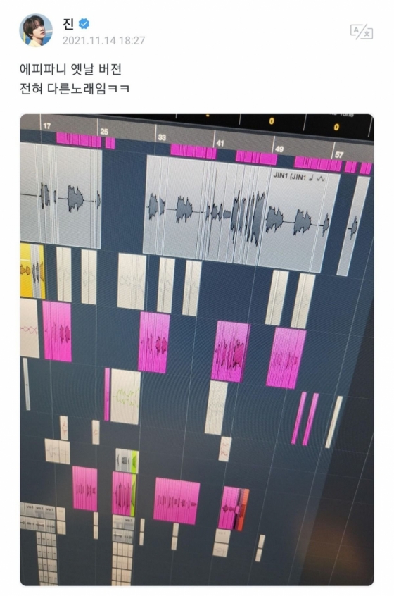 진은 지난 14일 글로벌 팬 커뮤니티 플랫폼 위버스(Weverse)에 "에피파니 옛날 버전. 전혀 다른 노래임ㅋㅋ"라는 글과 함께 캡처 한장을 게시했다.