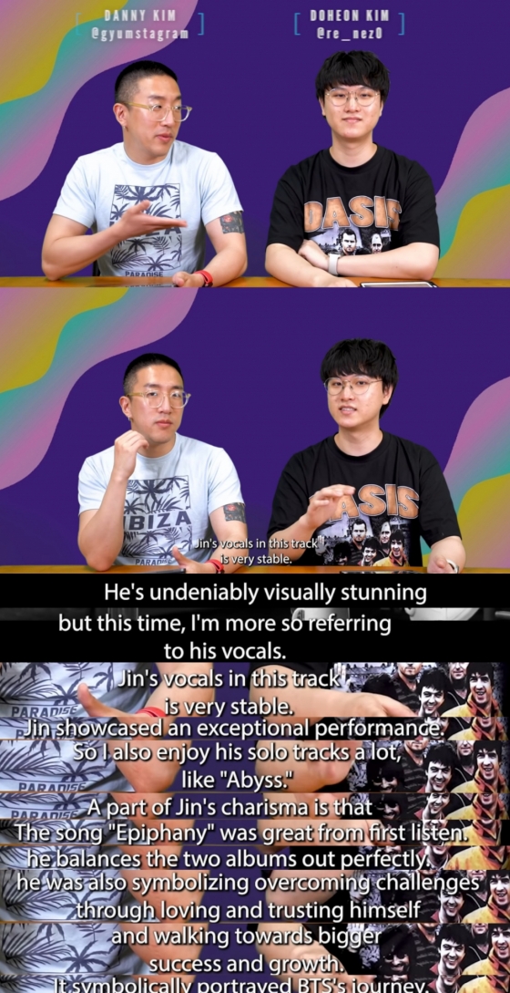 김도헌 평론가는 "멤버 진을 굉장히 좋아하는데 비주얼도 굉장히 훌륭하지만, 제가 얘기하는 건 보컬이다. 진의 목소리가 굉장히 안정적이다.", "고음도 굉장히 잘하고 전하지 못한 진심, '돈 리브 미'(Don't Leave Me)등의 노래들에서 진이 굉장히 인상적인 퍼포먼스를 많이 보여준다. 그래서 저는 진의 솔로곡도 굉장히 좋아한다. '어비스'(Abyss) 같은 노래들...", "에피파니는 처음 들었을 때부터 굉장히 좋았다.", "진의 보컬이 중심을 잘 잡아주고 있다"며 진의 보컬을 극찬했다.