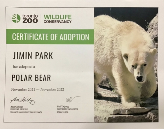지민의 이름으로 입양한 북극곰은 2021년 11월부터 2022년 11월까지 1년간 지원받게 된다.