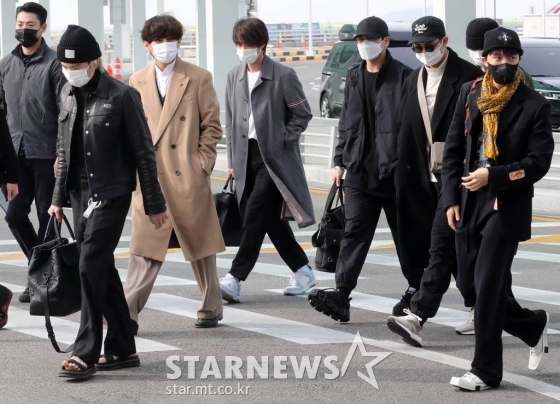 이날 멤버들은 남다른 공항 패션을 소화하면서 현장을 찾은 수많은 팬들에게 손 인사를 건넨 이후 출국장으로 향했다.