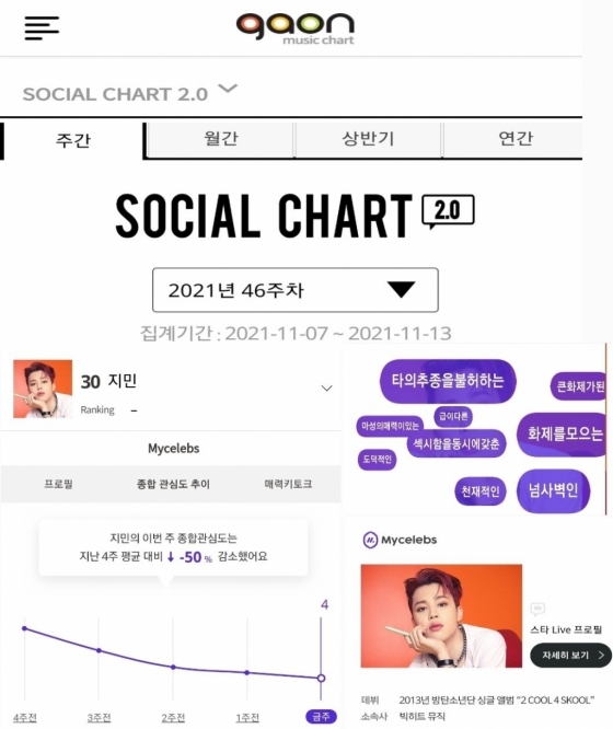 지민은 유튜브(YouTube), 틱톡(TikTok), 브이라이브(V LIVE), 뮤빗(Mubeat), 마이셀럽스(Mycelebs) 소셜지수인 소셜미디어 종합 인기도 차트 '가온 소셜 차트 2.0'의 46주차 (2021.11. 07 ~ 2021. 11. 13)에서 30위를 기록, 개인 활동이 전혀 없음에도 가온 소셜차트에서 꾸준히 안착중이다.