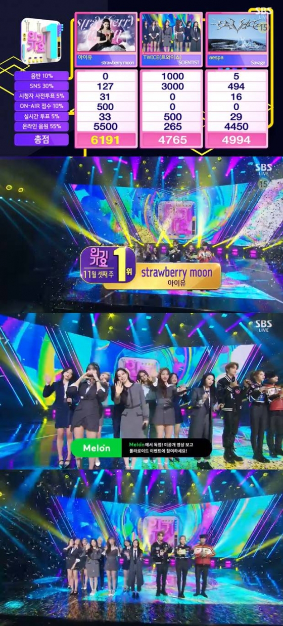21일 오후 방송된 SBS 음악 프로그램 '인기가요'에서는 아이유가 1위를 차지했다. 이날 11월 3주차 1위 후보로 아이유 'strawberry moon'(스트로베리 문), 트와이스 'Scientist'(사이언티스트), 에스파 'Savage'(세비지)가 올랐다.
