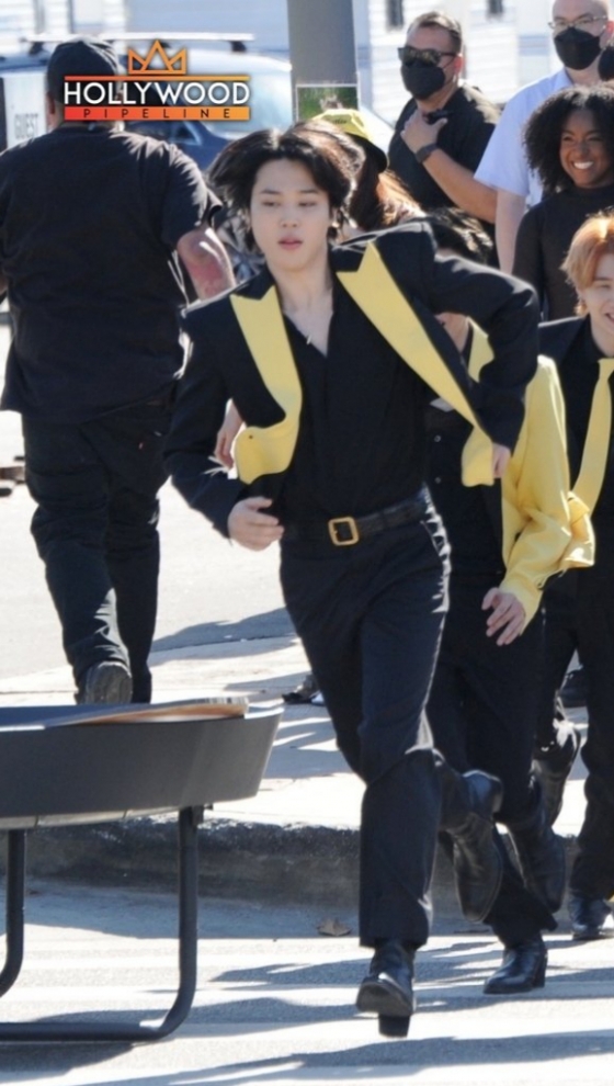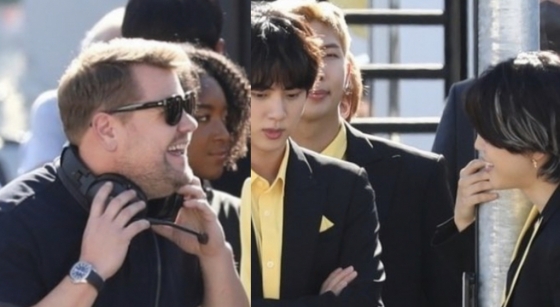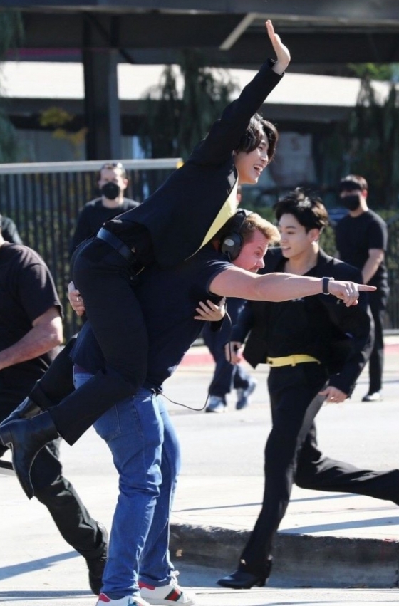 차도에 차가 멈춰있는 시간동안 짧은 공연후 급히 빠져나오던 지민이 황급히 달리다 살짝 미끌어지자 코든이 재빨리 달려가 지민을 업고 뛰어나오는 설정의 촬영에서 둘의 케미에 현장의 환호가 쏟아졌다.