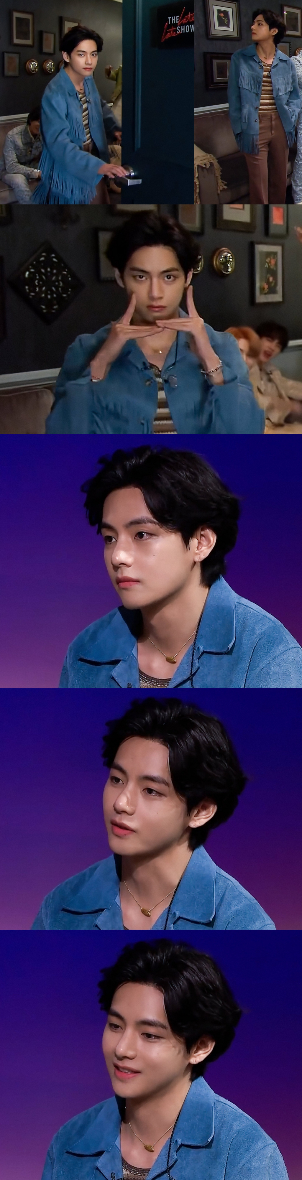 제임스 코든쇼에 출연한 뷔는 방탄소년단이 소개되자 문을 열고 한층 더 능숙해진 핑거터팅 댄스를 하며 등장했다. 뷔의 잘생긴 얼굴과 귀여운 댄스는 시청자들의 시선을 끌었다.