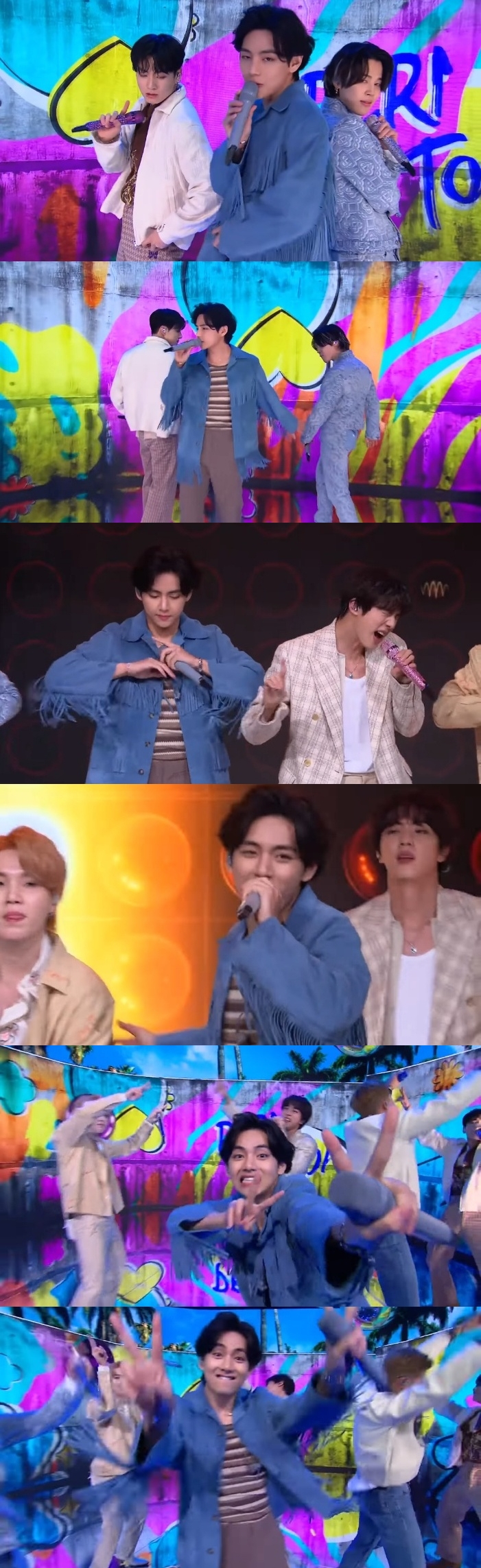 인터뷰에 이어 '퍼미션 투 댄스' 퍼포먼스가 펼쳐졌다. 뷔는 이마를 드러낸 블랙 헤어에 술이 달린 카우보이 스타일의 재킷을 입고 등장했다. 뷔의 화려하고 이목구비는 자두 같이 동그란 얼굴과 개구쟁이 같은 천진난만한 웃음과 대비돼 묘한 매력을 발산했다.