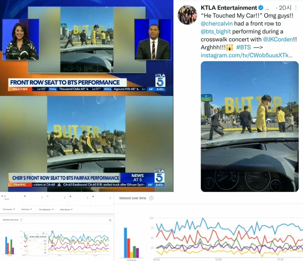 KTLA 방송국의 앵커 셰어 캘빈(Cher Calvin)은 우연히 신호등에 멈춰 바로 눈앞에서 방탄소년단의 공연을 보는 행운에 당첨됐다. 그가 깜짝 놀라며 찍은 영상에는 뷔가 짧은 시간에도 여유롭게 차에 다가와 손을 짚으며 퍼포먼스를 펼치는 장면이 생생하게 찍혀 있었다.