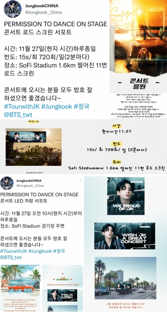 '정국 차이나'는 콘서트 첫째 날인 27일 하루 종일, 소파이 스타디움으로 찾아오는 팬들도 접할 수 있는 11번 로드 스크린 응원 광고 서포트를 실시한다고 게재했다.