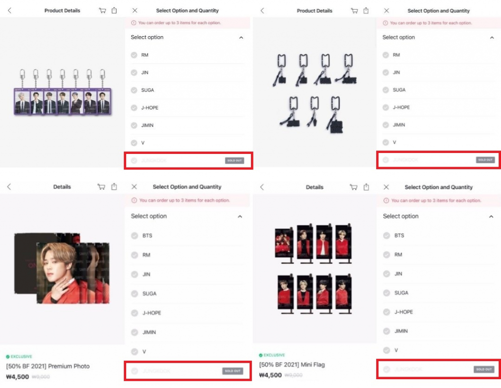 당일 오후 10시에는 정국의 '맵 오브 더 소울 ON:E' 프리미엄 포토와 미니 플래그가 멤버들 중 가장 먼저 품절되는 등 총 4가지가 순식간에 완판됐다.