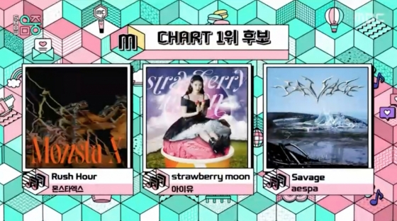 몬스타엑스는 'Rush Hour', 아이유는 'strawberry moon', 에스파는 'Savage'로 나란히 1위 후보가 됐다.