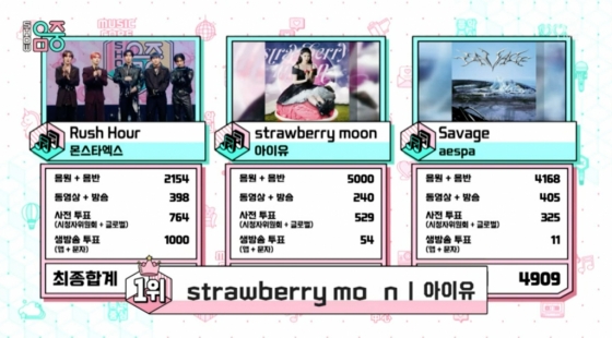 이날 '쇼! 음악중심' 1위 후보로는 몬스타엑스 'Rush Hour', 아이유 'strawberry moon', 에스파 'Savage'가 이름을 올렸다.