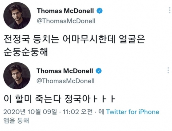 앞서 지난해 10월에는 토마스 맥도넬이 "이 할미 죽는다 정국아ㅏㅏㅏ"라며 정국 앓이 글을 써 한 차례 폭풍 애정을 보였고 보는 이들을 폭소케 했다.