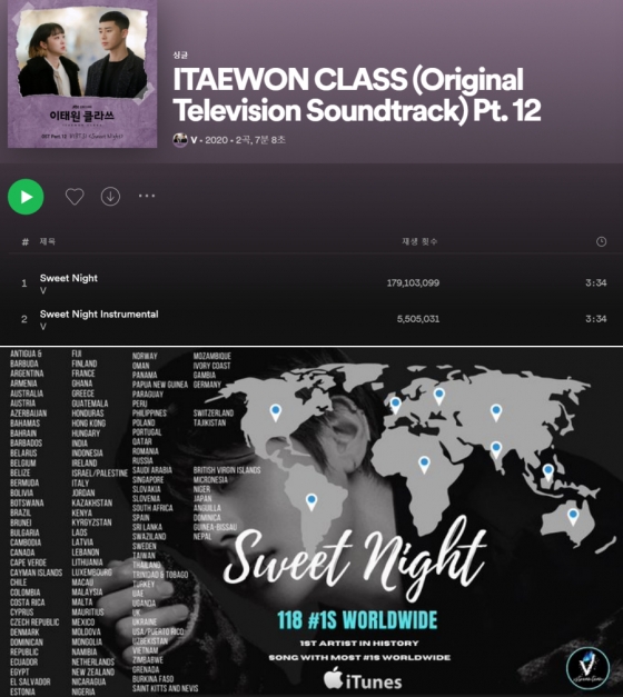 'Sweet Night'은 스포티파이 한국 OST 역대 스트리밍 1위를 비롯, 아이튠즈 톱송차트 118개국 1위라는 세계 최고기록을 뷔에게 안겨주며 대중적으로 대성공을 거뒀다.