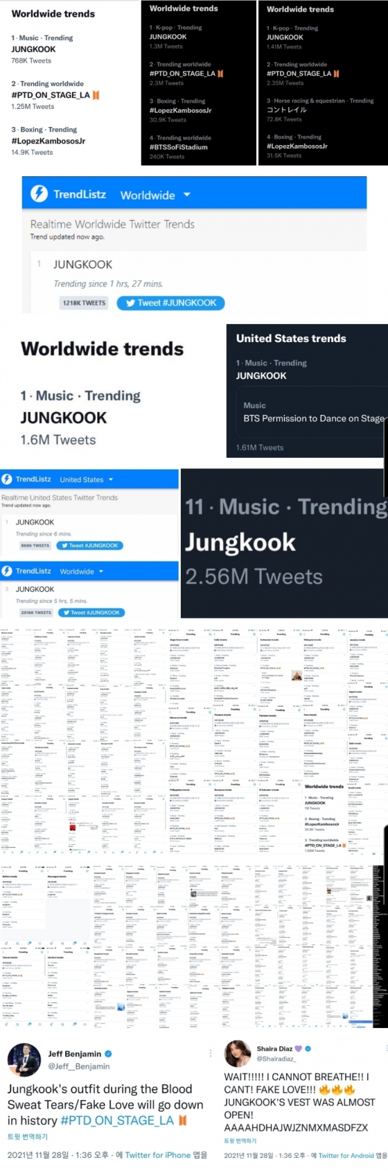 이에 콘서트 시작 약 1시간 만에 트위터에서 'JUNGKOOK'이 월드와이드(전세계) 트렌드 1위를 비롯해 현지 미국 실시간 트렌드 1위에 오르는 폭발적 인기를 나타냈다.
