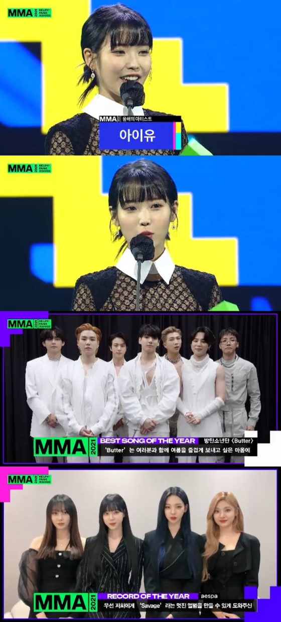 아이유는 4일 오후 온라인으로 개최된 'MMA2021'(멜론뮤직어워드2021)에서 올해의 아티스트상을 수상, 5관왕을 차지했다.