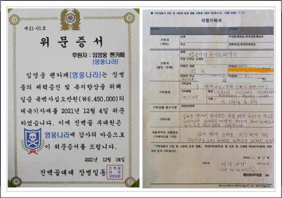네이버공식카페 영웅나라 회원들은 12월 KBS 단독쇼를 앞두고 있는 임영웅을 응원하기 위해 마음을 모아 임영웅이 군복무했던 백골부대 장병들에게 645만원 상당 체육용품을 기증했다.