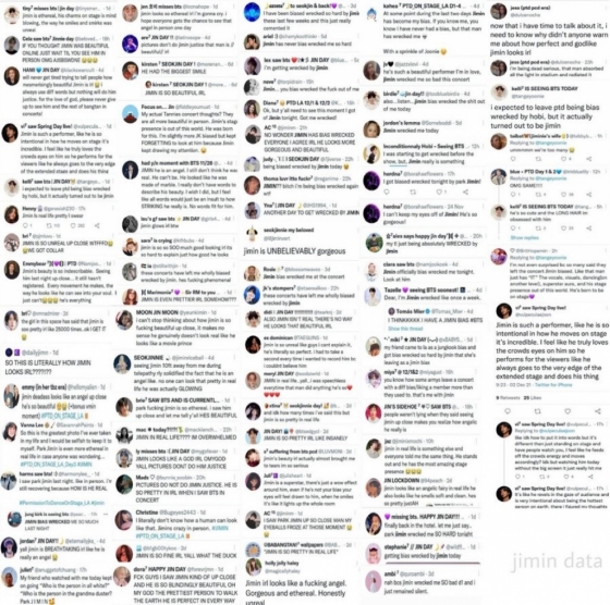가장 많은 최다 트윗량은 'jimin'으로 760만 건 이상 언급되었으며, 참여한 수가 무려 4460만 건 이상으로 멤버들 가운데 가장 많은 언급량을 쏟아낸 지민은, 콘서트 기간 내내 최고의 화제였다.