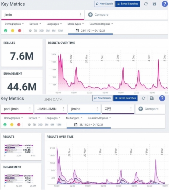 트위터(Twitter)에 따르면 방탄소년단의 콘서트 'BTS 퍼미션 투 댄스 온 스테이지-LA'가 진행된 11웍 28일 29일과 12월 2일과 3일 그리고 '2021 징글볼 투어'(2021 Jingle Ball)가 열린 4일까지 지민의 이름 5개의 키워드에 대해 무려 1,450만 건이 넘는 트윗이 쏟아졌다.