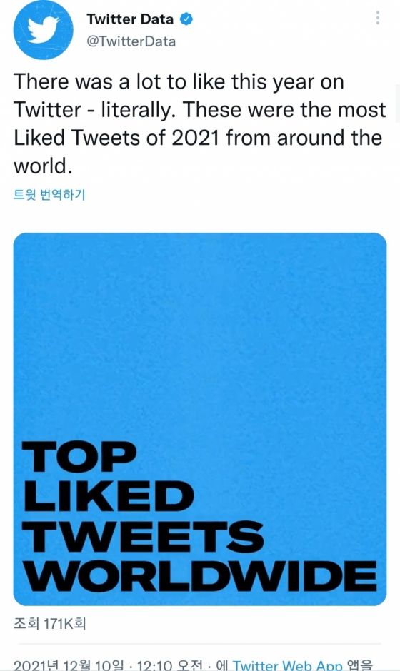 최근 트위터 데이터는 '2021년 전세계에서 가장 많은 '좋아요'를 받은 트윗' TOP5를 공식 발표했다.