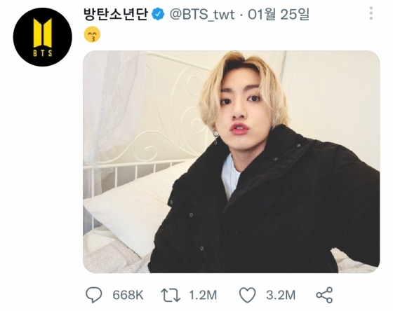 해당 트윗은 정국이 지난 1월에 방탄소년단 공식 트위터 계정을 통해 게재한 '금발 셀카' 트윗으로 326만 '좋아요'를 받았다.