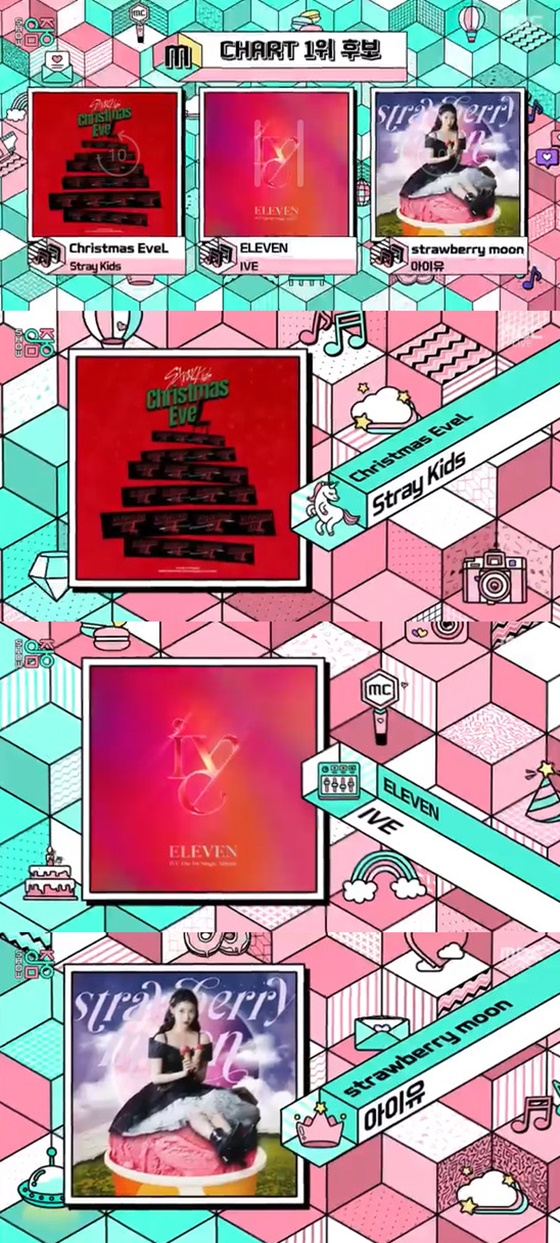 11일 방송된 MBC '쇼! 음악중심'에서는 스트레이 키즈의 '크리스마스 이블 (Christmas Evel)', 아이브의 '일레븐 (ELEVEN)', 아이유의 '스트로베리 문 (Strawberry moon)'이 1위 후보에 올랐다.