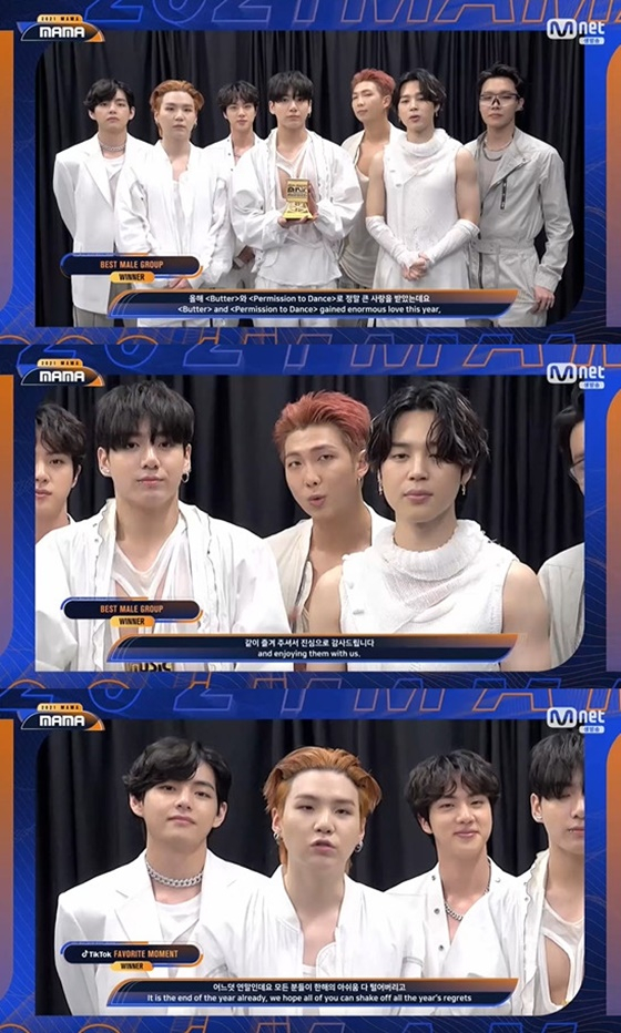 방탄소년단은 영상을 통해 "올해도 아미와 사랑과 응원 덕분에 'MAMA'에서 귀한 상을 받게 됐다"고 소감을 전했다.