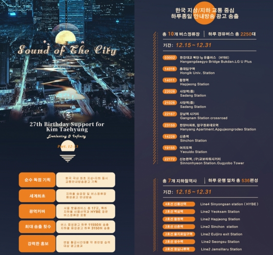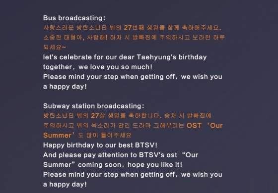 지난 14일 뷔의 중국 최대 팬클럽 '바이두뷔바'는 서울 시내 핫 플레이스를 커버하는 총 17곳의 버스 정류장과 지하철 역사에서 교통 안내방송 생일광고를 기획하게 되었다고 밝혔다.