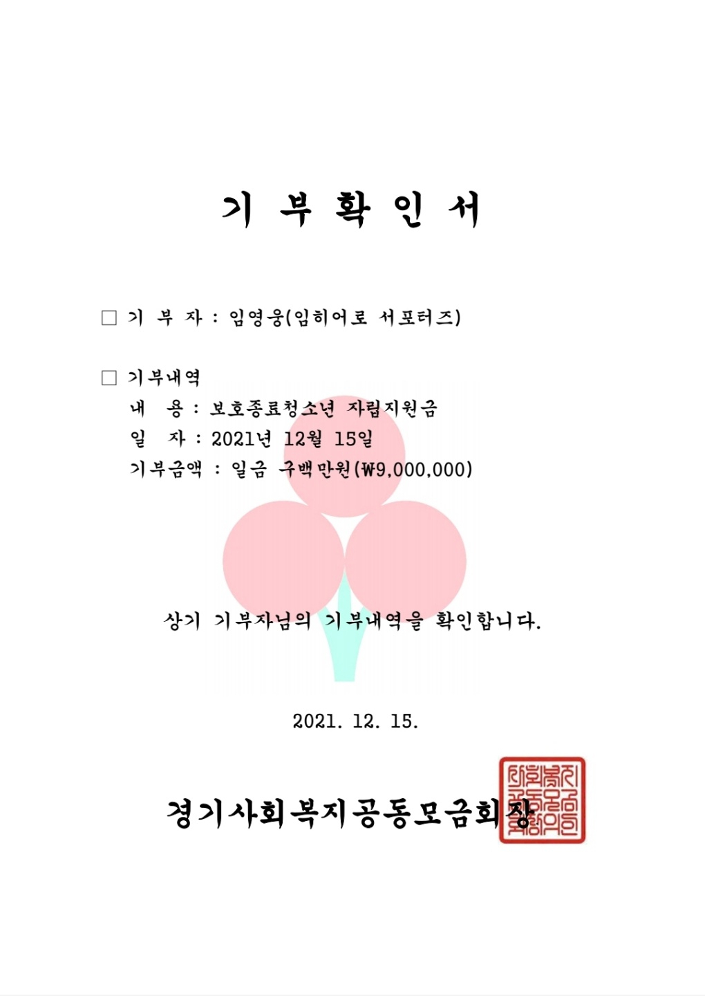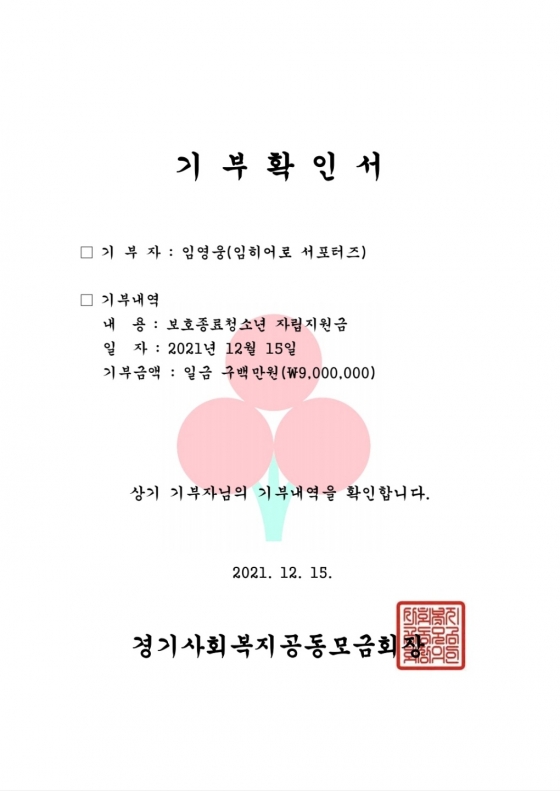 임영웅 팬클럽 영웅시대 임히어로 서포터즈는 12월 15일 사랑의열매 경기사회복지공동모금회(회장 이순선)에 보호종료청소년 자립지원사업으로 900만 원을 기부했다. 이번 성금은 임히어로 서포터즈 회원 1000여명이 클라우드펀딩을 통해 모았다.