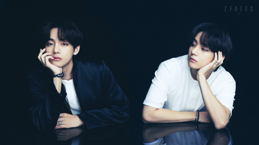 어둠과 같이 새카만 블랙의 배경은 빛으로 세공한 듯 선명하고 빛나는 뷔의 미모를 한층 더 돋보이게 하며 블랙홀처럼 시선을 빨아들였다.