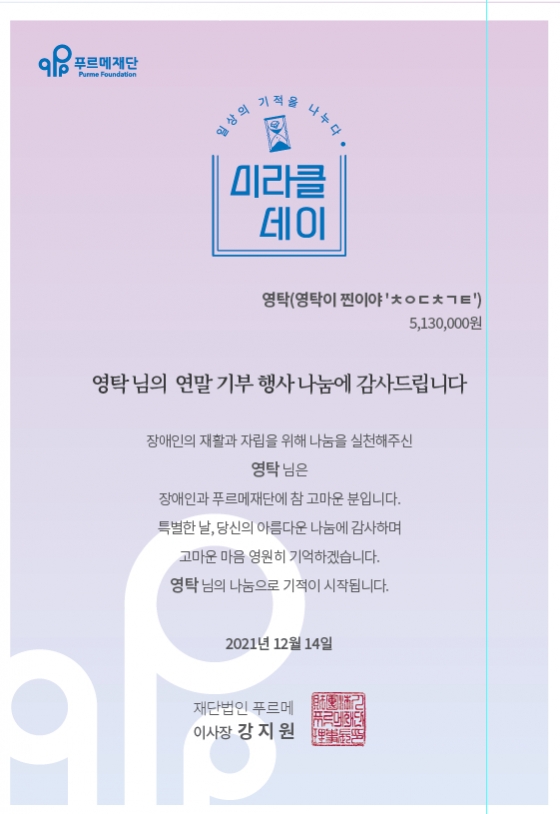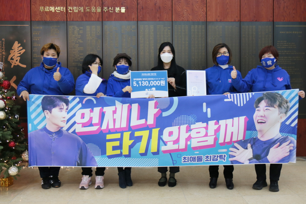 영탁 팬클럽 '영탁이 찐이야'는 연말연시 크리스마를 맞아 12월 14일 푸르메 재단에 513만 원을 기부했다.