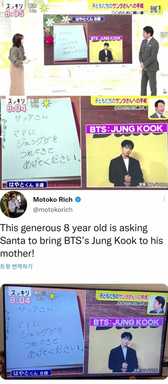 이날 방송에서 "산타 상, 우리 엄마에게 정국을 데려와 주세요"라고 산타에게 선물 대신 방탄소년단 정국을 소원으로 빈 8살 하야토 군의 편지가 공개됐다.