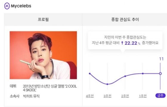 지민은 방탄소년단 멤버 중에서도 외부 콜라보 등 개인 활동이 전혀 없음에도 개인브랜드 평판 35개월 연속 1위 등 세계 각종 플랫폼 마다 최고의 성적을 올려, '가성비甲' 아이돌로 그 놀라운 인기가 유명하다.