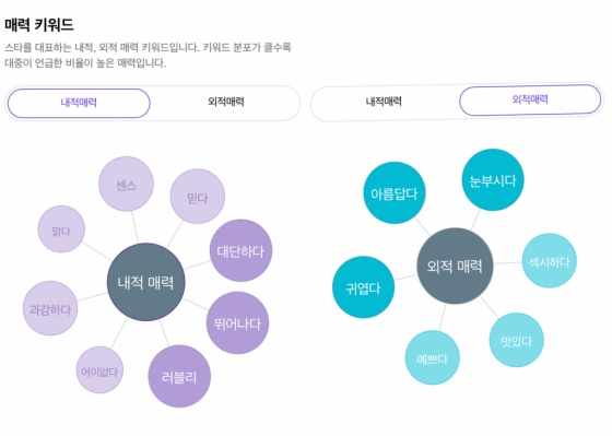 지민의 매력 키워드로는 '내적 매력: 뛰어난, 놀라운 사랑스러운 외적 매력 : 귀여운, 눈부신, 아름다운'이 선택됐다.